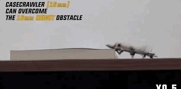 CaseCrawler的技术最大的亮点在于它的机械腿,在静止时可以伸展放平,从变速箱向腿部传送动力的齿轮组厚度只有1.5毫米,但轻薄的机械结构却相当结实。