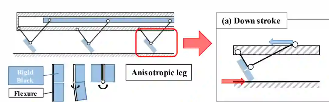 连接在腿部关节上的各向异性腿只在前行(向下用力)时向地面传力;在上行时膝关节被动弯曲,避免向后发力。