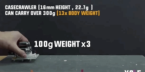 整个小机器人没有装到手机壳上时自重约23克,在负重300克(自重的13倍)的情况下,还能以每秒21cm的速度前进:
