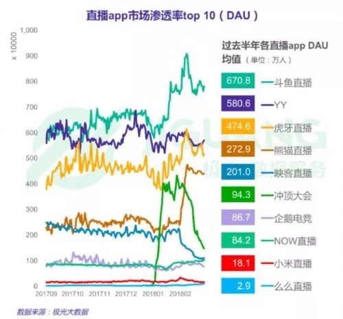 在上市宣传中,虎牙称自己是中国最大的游戏直播平台,但极光大数据发布的《2018年3月直播app行业研究报告》显示,斗鱼的渗透率、日均新增用户数等数据都要好于虎牙。报告显示,市场渗透率最高的三款直播app分别是斗鱼、虎牙和YY直播。从过去半年的日活跃用户数均值来看,斗鱼、YY直播和虎牙位列前三,分别为670.8万、580.6万和474.6万。