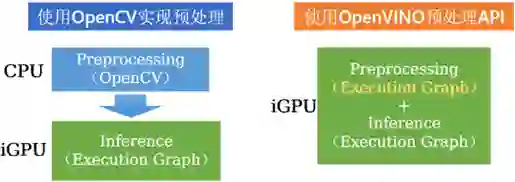 提供预处理API函数。OpenVINO™ 2022.1之前版本不提供OpenVINO runtime原生的用于数据预处理的API函数,开发者必须通过第三方库,比如,OpenCV,来实现数据预处理。OpenVINO™ 2022.1自带的预处理API可以将所有预处理步骤都集成到在执行图中,这样iGPU、CPU、VPU 或今后Intel的独立显卡都能进行数据预处理,大大提高了执行效率;相比之前,用OpenCV实现的预处理,则只能在CPU上执行,如下图所示。