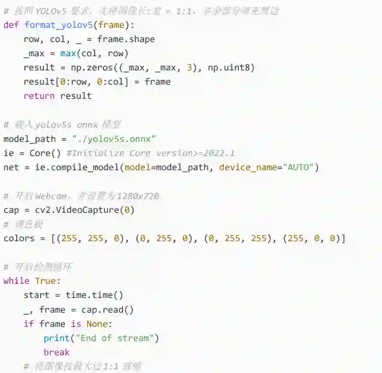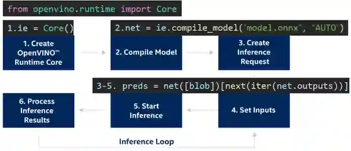 使用OpenVINO™ 2022.1开发推理程序的典型步骤如下所示,从图中可见,三行 OpenVINO API函数可以完成YOLOv5s.onnx模型的推理。