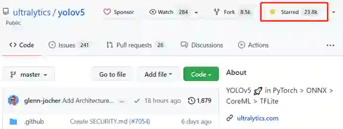 由于其工程化和文档做的特别好,深受广大AI开发者的喜爱,GitHub上的星标超过了23.8K,而且被PyTorch官方收录于PyTorch的官方模型仓。在产业实践中,也有无数的开发者将YOLOv5直接用于自己的项目。