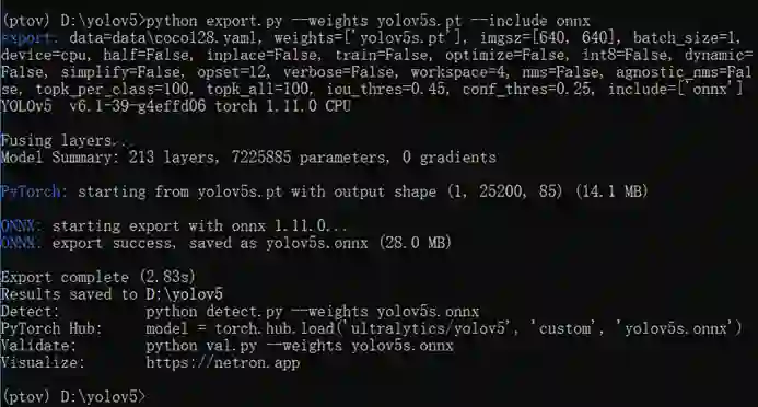 在YOLOv5文件夹下,使用命令:python export.py --weights yolov5s.pt --include onnx,完成YOLOv5s.onnx模型导出,如下图所示。