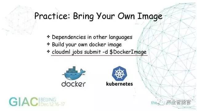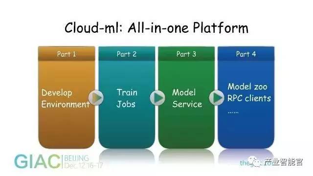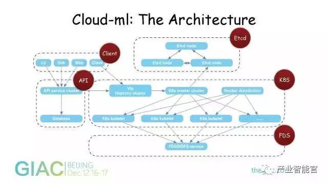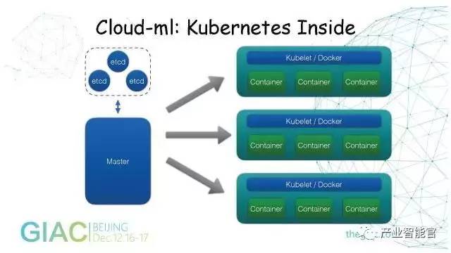 最上层是用户业务,有广告、搜索、游戏等,都有自己的业务场景,可以根据自己的数据格式编写一些Tensorflow、深度学习的脚本。通过Cloud-Ml的API把任务提交到服务端,由服务端创建一个容器,把它调用到真正的物理机计算资源上。