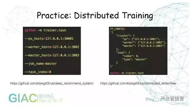 我们把用户的脚本拿出来以后,不需要它去管理服务器的环境,只需要声明这个集群有多少个PS、Worker和Master,把这些参数提交给Cloud-Ml的API服务,由它来申请可用的IP和端口。