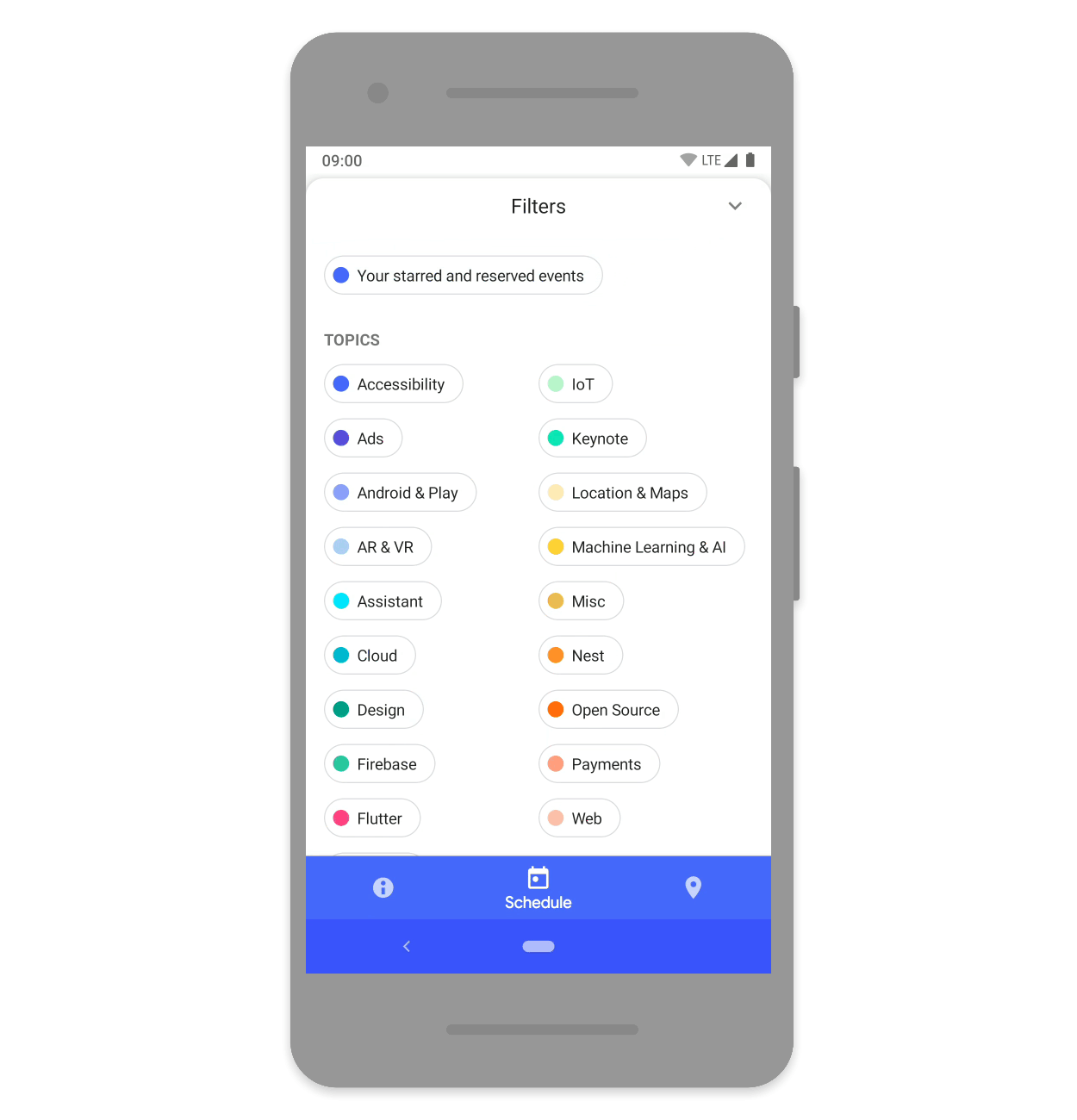 会议应用的核心功能之一是帮助用户从许多会议中过滤出感兴趣的那些。每个话题都有一个与之相关的颜色,以便识别。我们收到的设计方案基于 “Chip” 动画,便于用户与各个话题进行操作。