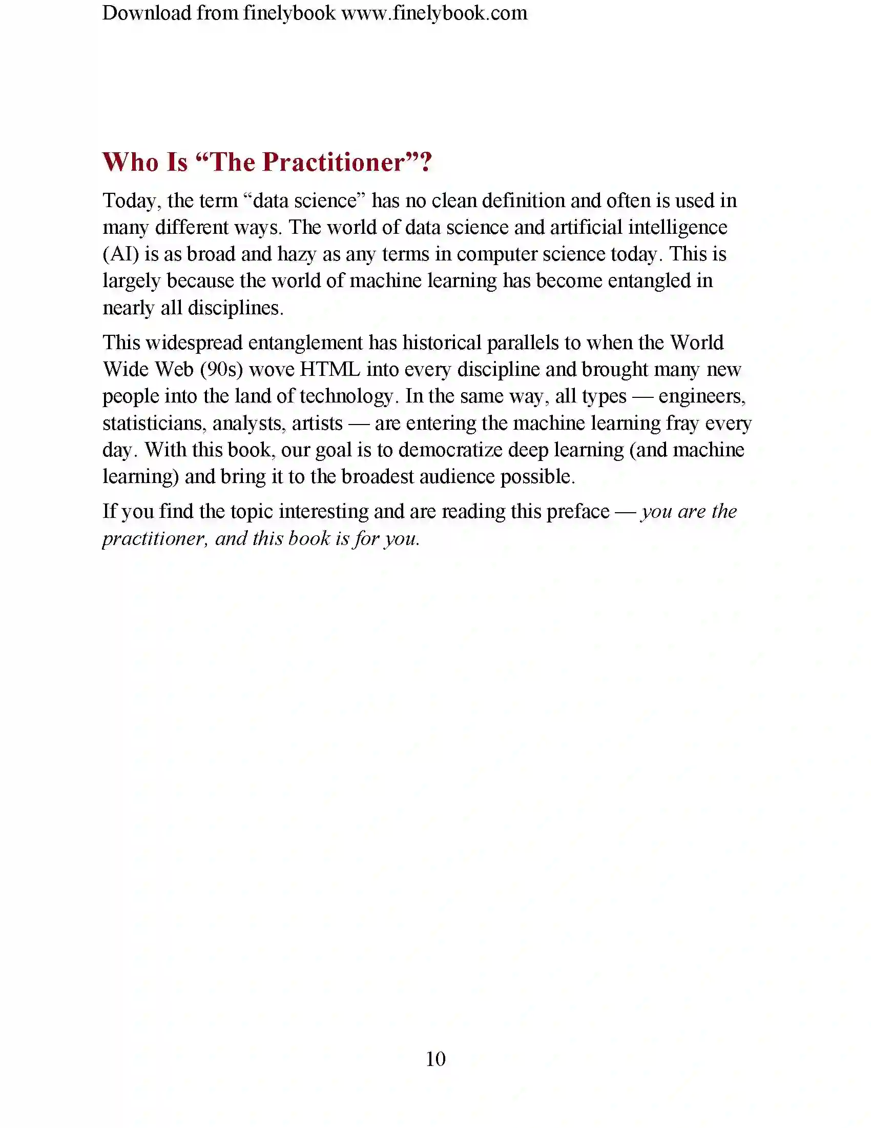 这种广泛的交织与WWW(90年代)将HTML融入各个学科,并将许多新人带入技术领域的历史相似。同样,所有类型的工程师,统计学家,分析师,艺术家,每天都在进入机器学习领域。这本书的目标是使深度学习(和机器学习)大众化。