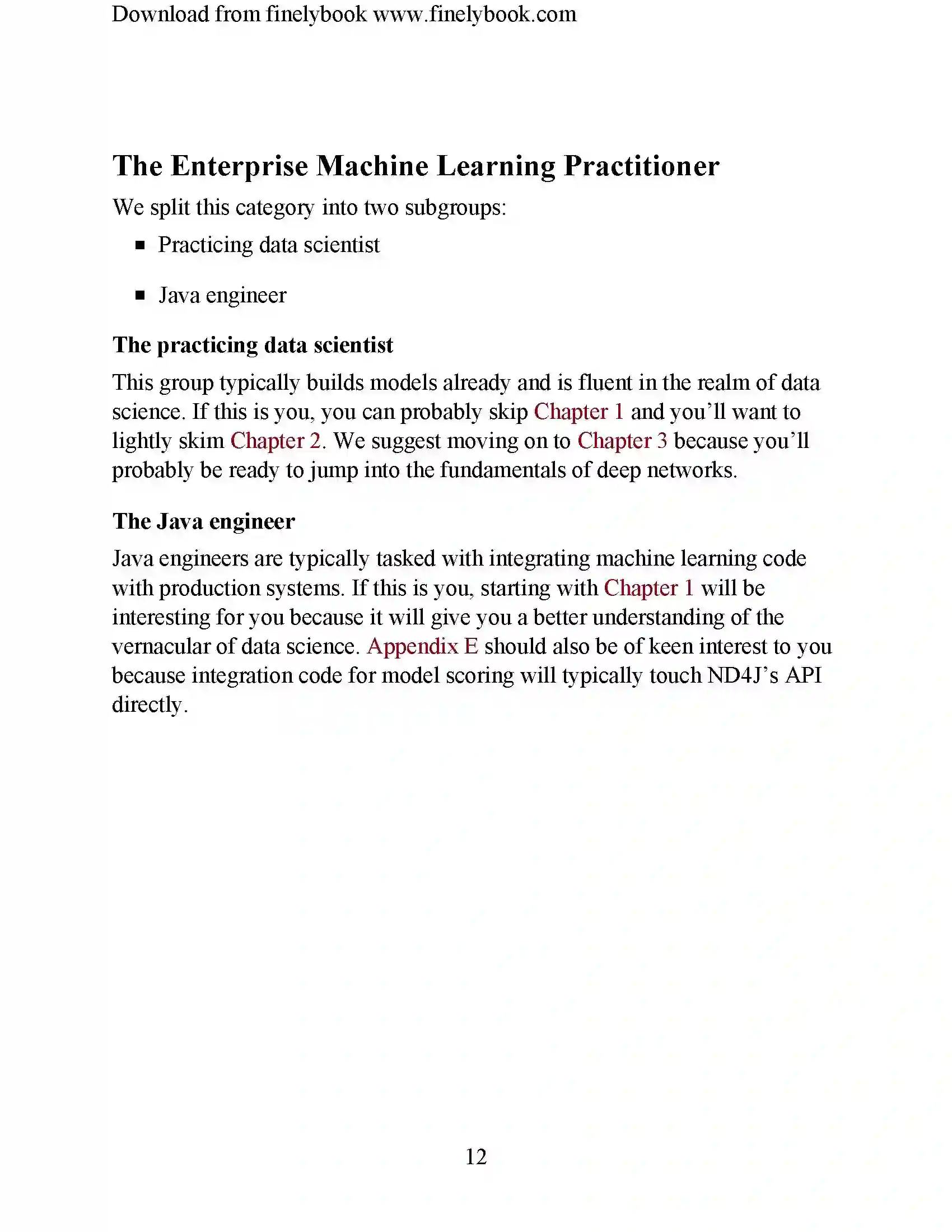 本书前四章的重点是介绍充分的理论和基础知识,为实践者提供本书其余部分的工作基础。接下来的五章将从这些概念出发,利用DL4J进行一系列深度学习实战: