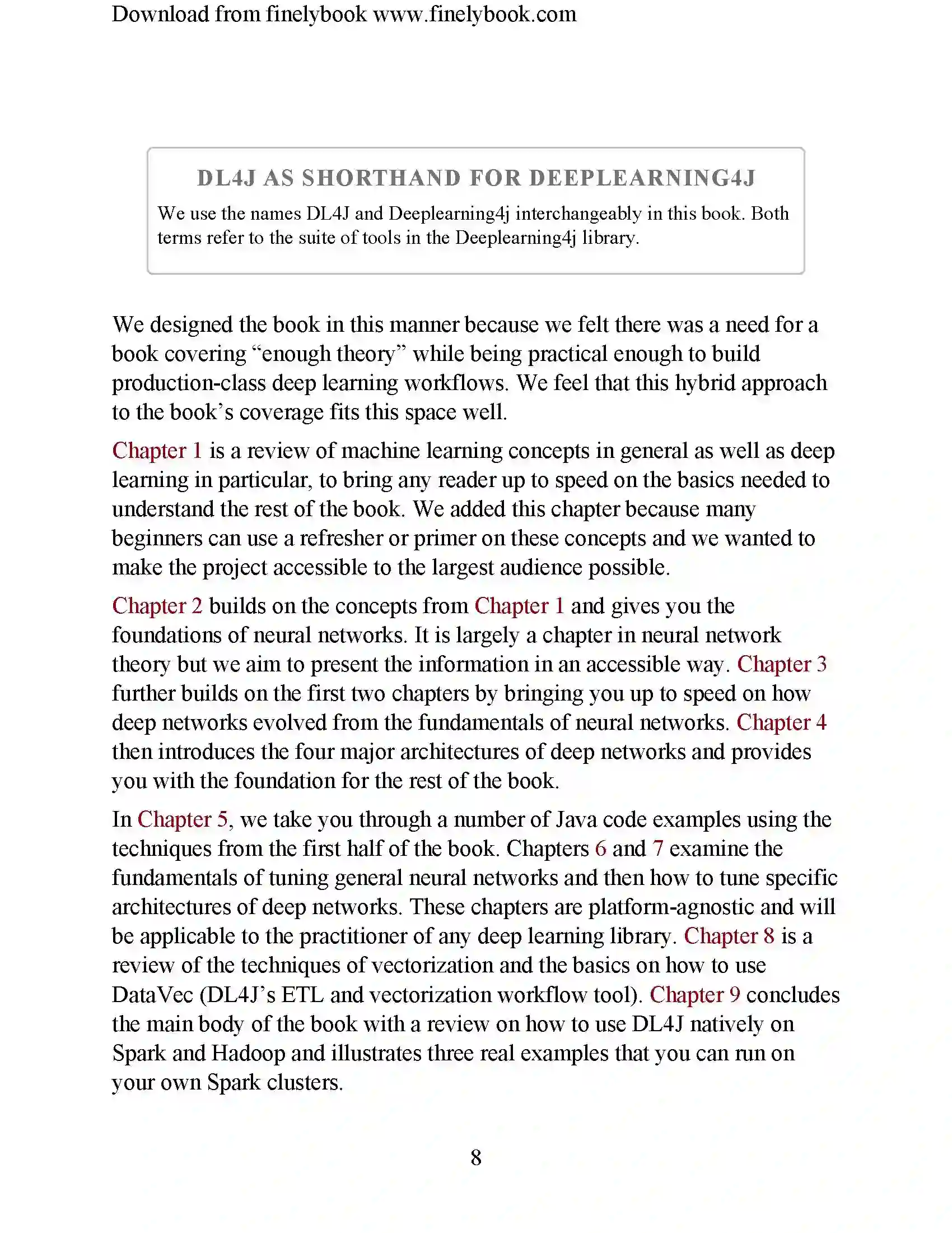 第8章回顾了矢量化技术以及如何使用DataVec(DL4J的ETL和矢量化工作流工具)的基础知识。