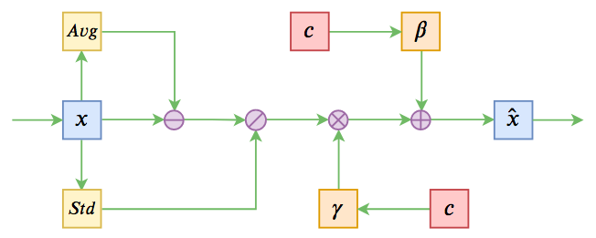 不过这些经典工作都不是本文要介绍的。本文关注的是以一个固定长度的向量作为条件的文本生成的场景,而方法是 Conditional Layer Normalization——把条件融合到 Layer Normalization 的 β 和 γ 中去。