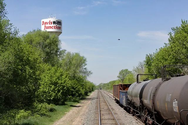 references: [u'A train carrying chemical tanks traveling past a water tower.', u'Dual train tracks with a train on one of them and a water tower in the background.', u'a train some trees and a water tower ', u'Train on tracks with water tower for Davis Junction in the rear.', u'A train on a train track going through a bunch of trees.']