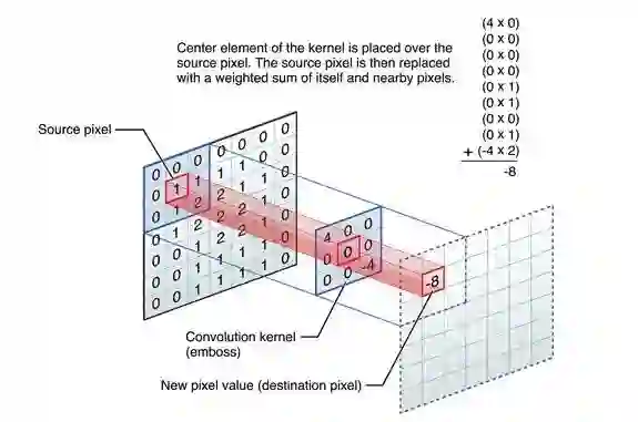 卷积是如何进行的。每一个像素由周围像素的加权和所替代,神经网络会学习这些权重。
