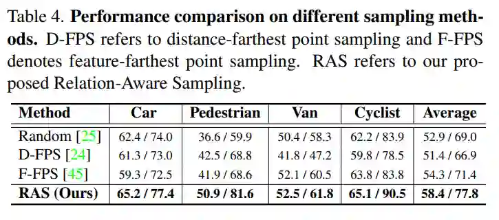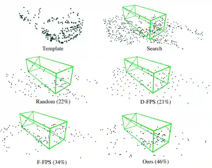 点云的稀疏性是跟踪算法的一大挑战,而点云的特征提取通常伴随着下采样的过程。现有跟踪算法大多采用随机采样的方式,会在采样过程中在搜索区域丢掉大量的前景点,不利于后续的特征匹配。所以我们提出语义感知采样,利用模板和搜索区域的特征距离进行采样。由于模板区域大多数由目标物体上的点云组成,因此我们在搜索区域采样那些特征距离和模板尽可能小的点,就能尽可能地得到更多的前景点。如下图所示,我们对比了不同的采样方法,采样得到的点中位于3维目标框中的比例,可以明显地看到我们提出的RAS最大程度地得到了前景点。