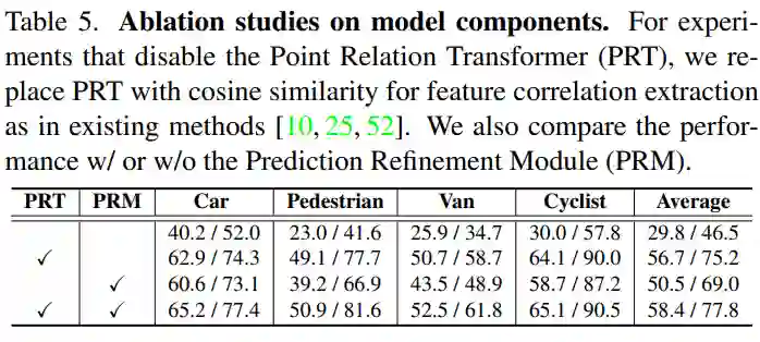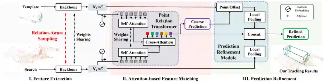针对以上提出的问题,我们提出了一个新颖的点云跟踪框架,如下图所示。模型分为三个阶段:在特征提取阶段,我们提出了一种新的语义感知采样方法(Semantic-Aware Sampling),利用模板和搜索区域的特征关系来进行采样,从而保存更多的前景点。在特征匹配阶段,我们提出了一个点云关系Transformer结构(Point Relation Transformer),对模板和搜索区域的特征进行有效匹配。最后我们提出一个预测修正模块(Prediction Refinement Module),通过特征采样的方式来进一步提高预测的准确性。