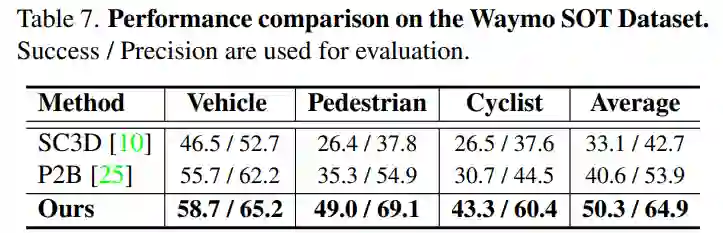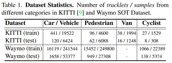 除了方法上的贡献,我们还提出了一个基于Waymo Open Dataset新的大规模点云跟踪数据集。由于Waymo中对于每个目标都标注了对应的ID,因此可以提取出某个ID在不同时刻的位置信息,基于此,我们制作了Waymo的单目标跟踪数据集,如下表所示,我们制作的Waymo跟踪数据集在数据量上远远超过了KITTI,为学术界在大数据集上进一步的研究提供了一个baseline。