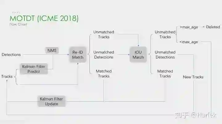 这是刚才列举的第一篇论文(MOTDT)的流程图,大概和DeepSORT差不多。这个图画的比较简单,其实在NMS之前有个基于SqueezeNet的