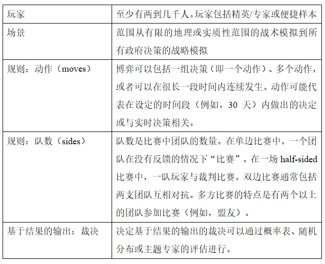 第三,兵棋推演具有规定人类玩家如何与场景互动的规则。规则可能是严格的,其中玩家有一组有限的动作,或者允许自由博弈,玩家几乎没有限制。这些规则可以塑造玩家的行为和结果,最终影响观察者从博弈中得出的结论。因此,规则会产生复杂的设计权衡。例如,免费游戏会使复制变得困难,而僵化游戏更有可能不自然地限制结果。尽管规则是博弈与许多模拟、模型和实验共有的特征,但兵棋推演(尤其是具有多个动作、玩家或团队的兵棋推演)通常使用更复杂的规则来管理团队如何互动,同时允许更广泛的行为选择,因此,导致结果差异更大。