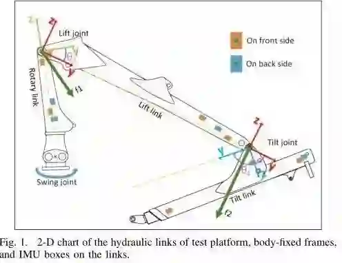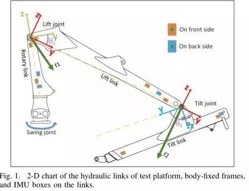 图1 测试平台、车身固定框架和连杆上IMU箱的液压连杆的二维图。