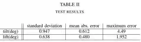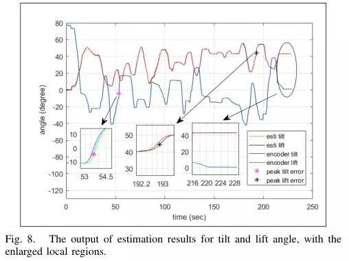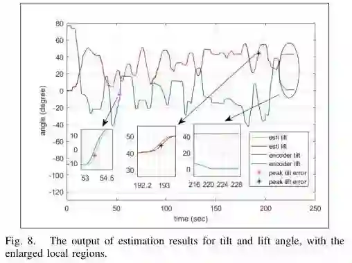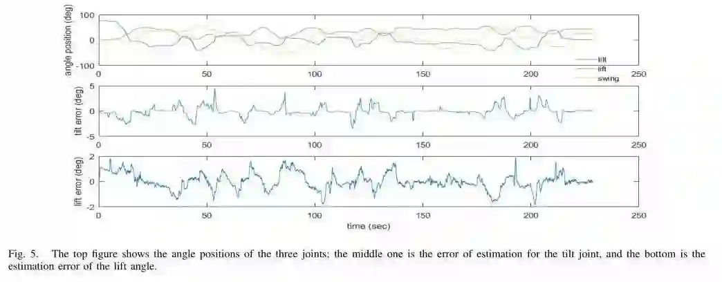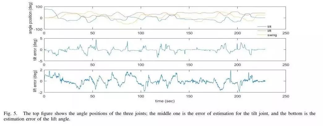 图5 上图显示了三个关节的角度位置;中间一个是倾斜关节的估计误差,底部是升力角的估计误差。
