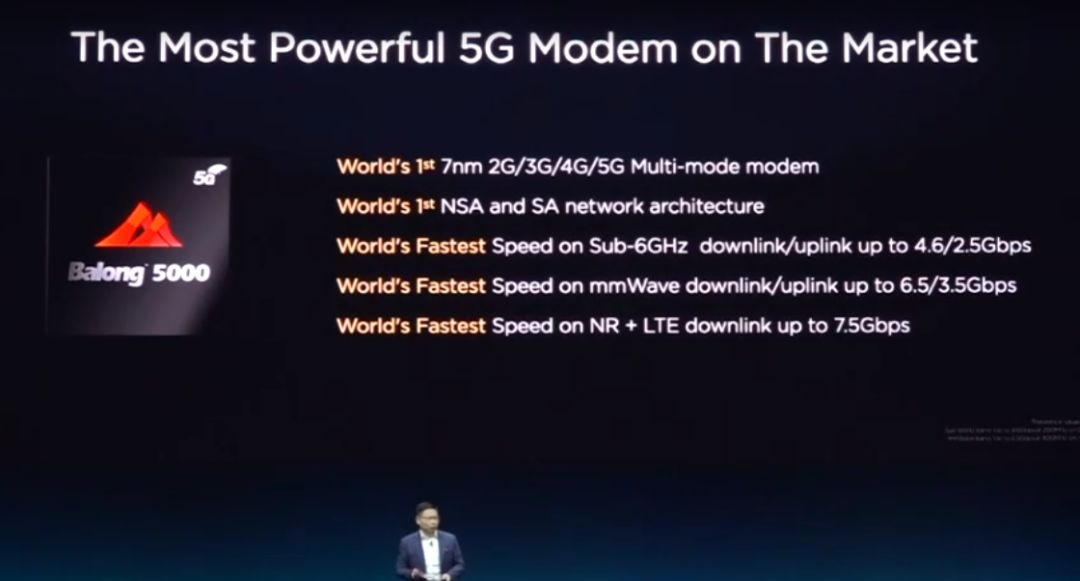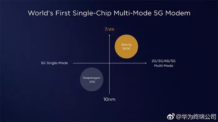在 5G 基带上,华为已经推出了商用产品巴龙 5000,是全球首款单芯片多模 5G 基带,而且采用了 7nm 工艺,遥遥领先于友商的产品。它不仅支持 5G SA 独立以及 NSA 非独立组网,还兼容 4G、3G、2G 网络。