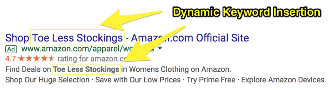 如此庞大规模的关键词广告对应巨大的工作量,为此亚马逊使用「动态关键词插入 (Dynamic Keyword Insertion,DKI)」技术,来使你正在搜索的关键词根据预置的广告模板,自动出现在广告的标题和描述里。