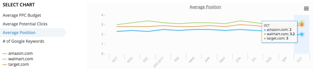 并非每个关键词的搜索结果平均位置都在第一位,但亚马逊在搜索结果页的平均广告位排序上,一直超过数以百万计的其他广告主(包括沃尔玛和塔吉特公司)。
