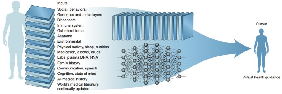 图 3:使用多模态数据输入和算法的虚拟医疗教练模型,能够提供个性化的指导。使用来自个体的全面输入的虚拟医疗教练经过深度学习后,可以为人们提供保持健康的建议。