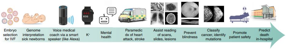 图 2:AI 在人类生命周期中的应用实例。dx 表示诊断;IVF 表示体外受精;K+ 表示血钾水平