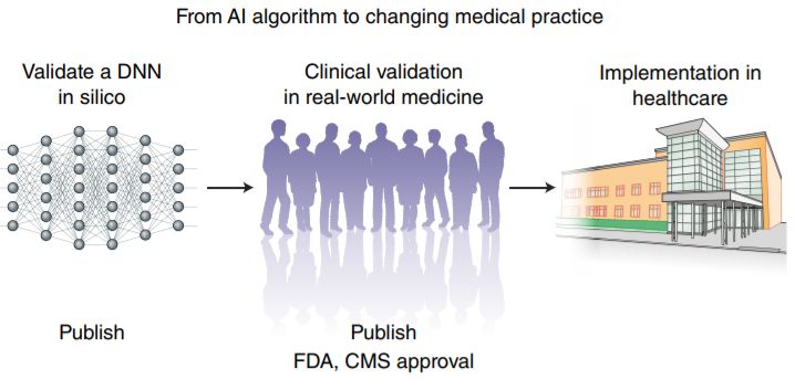 图 4:呼吁医学领域中 AI 研究应有正当的程序。在患者护理中实现之前,必需先在有同行评议的期刊上发表结果,在真实世界医学场景中验证。