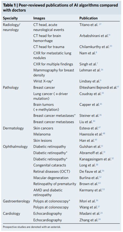 表 1:与医生比较的经过同行评议的 AI 算法论文