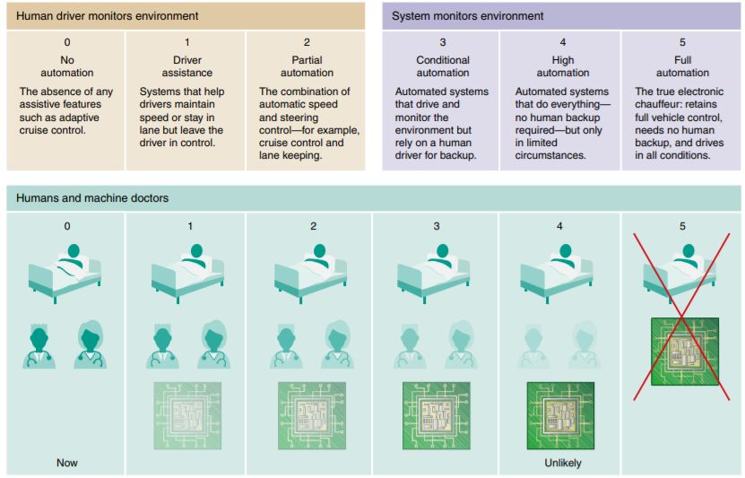 有了这些警告,对 AI 最终将如何整合进来要有合理的预期,这一点也很重要。现今有一种广泛的炒作,说是医生会被机器取代,我们可以将其与现实测试的自动驾驶汽车模型类比看看。大多数人都同意自动汽车是到目前为止 AI 最顶尖的技术成就,但「自动」一词颇具误导性。汽车工程师协会(SAE)已经定义了五个自动化层级,其中第 5 级表示在所有情况下都完全由汽车控制,人类没有任何可能性作为后备或接管汽车。现在普遍认为这种定义的完全自动化很可能永远无法实现,因为某些环境或道路条件会使得我们无法安全地使用这种车辆。基于同样的原因,医学可能永远无法突破第 3 级,这是一种有条件的自动化,因为其中肯定需要人类来监管算法对图像和数据的解读。很难想象在治疗病人时仅有非常有限的人类后备(第 4 级)。人类的健康太宝贵了——除了风险极小的日常事务之外,还远远不能将其托付给机器。