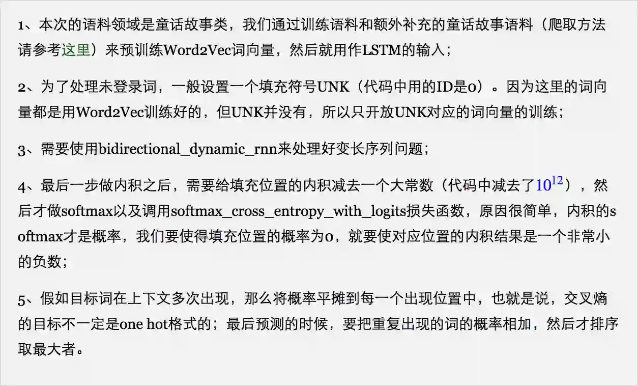 也就是说,特征与词做配对,是通过内积来实现的。这就提供了参考思路:如果我们让 LSTM 输出的特征与词向量维度一样大,然后将这个特征与输入的词向量一一做内积(配对),然后就可以做 softmax 了,这样就实现了只在上下文搜索。
