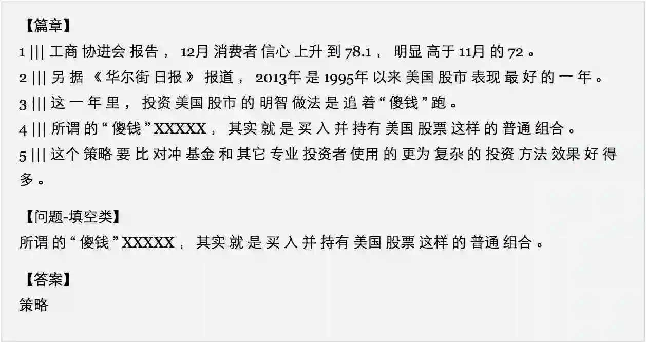 首先留意到,这个任务就是从上下文中挑选一个词来填到空缺的位置,如: