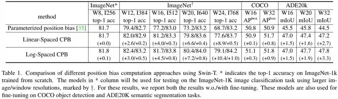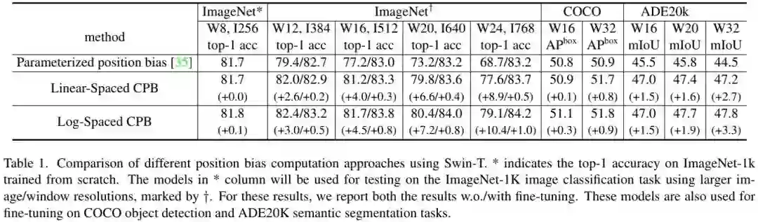 注: 是一个很小的网络,比如2层MLP。它对任意相对坐标生成偏置参数,因而可以自然地进行任意可变窗口尺寸的迁移。在推理阶段,每个相对位置的偏置可以预先计算并保存,按照原始方式进行推理。