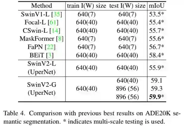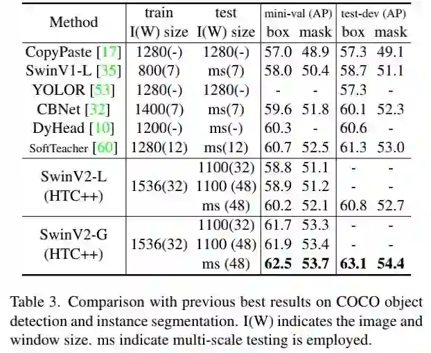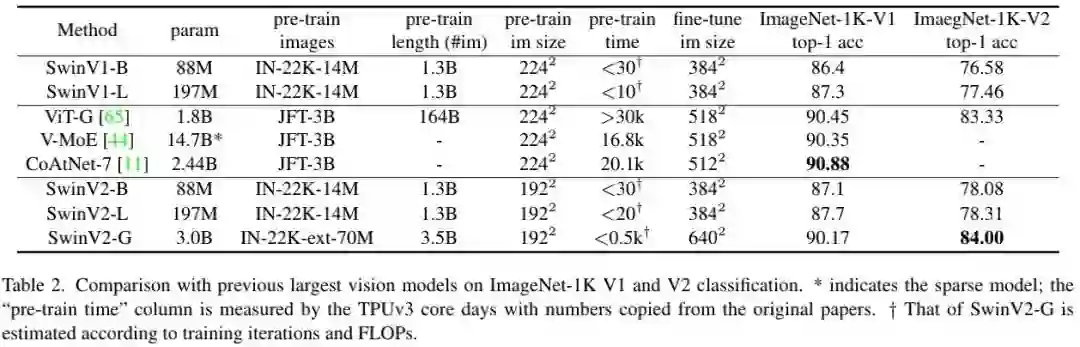 我们进一步对SwinV2进行更大尺寸缩放得到了658M与3B参数模型: