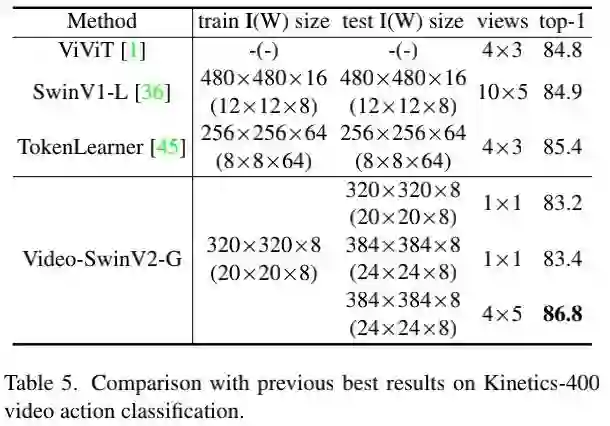 上表比较了Kinetics-400视频动作分类任务上的性能,可以看到:所提方案取得了86.8%的精度,比此前最佳高1.4% 。