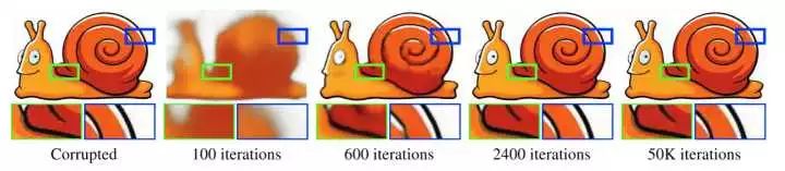 请看图片例子。最左边是目标图像,它经过JPEG压缩,有很多压缩瑕疵。网络的目标是学会输出它。在100次迭代后,网络学会了输出很模糊的形体。在2400次迭代后,网络学会了输出一张清晰光滑的高质量图片。在50000次迭代后,网络才学会了输出原图。