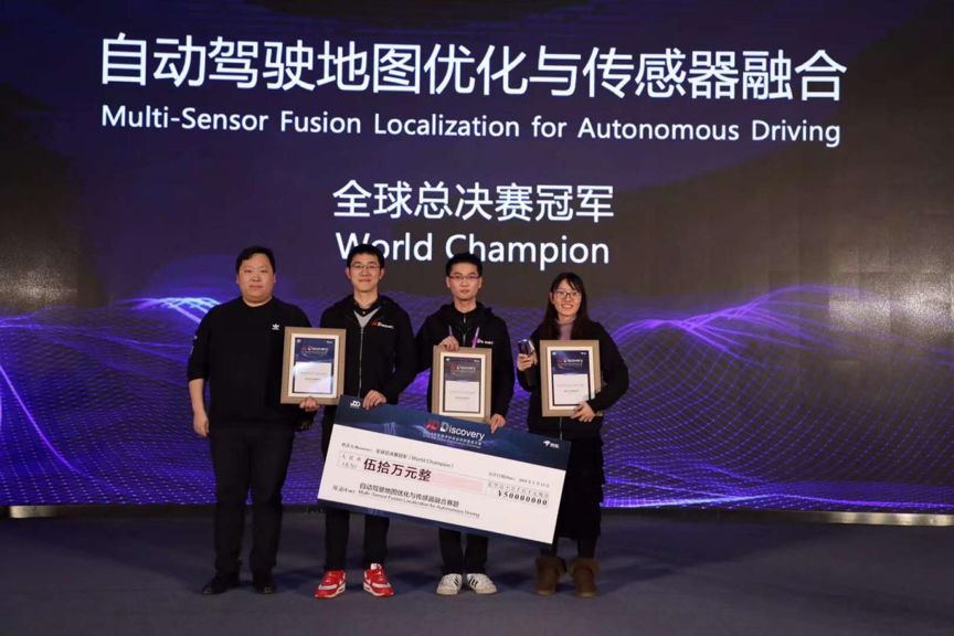 「自动驾驶地图优化与传感器融合」赛题全球总冠军 wh (左起:肖军、刘天弋、常乐、葛雯斐)
