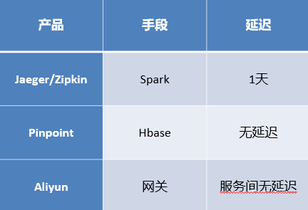 通过上图可以看出,Jaeger 和 Zipkin 是通过 Spark 做的,但是有一天的延迟;Pinpoint 本身是有自己的一套存储格式的,数据存在于Hbase,由于本身已经统计过了,所以完全没有可比性;阿里云主要是通过网关来实现,这个系统是针对网关统计的,因为请求和服务在部署时都会经过网关,通过服务与服务间的调用关系,因此服务间是无延迟的。