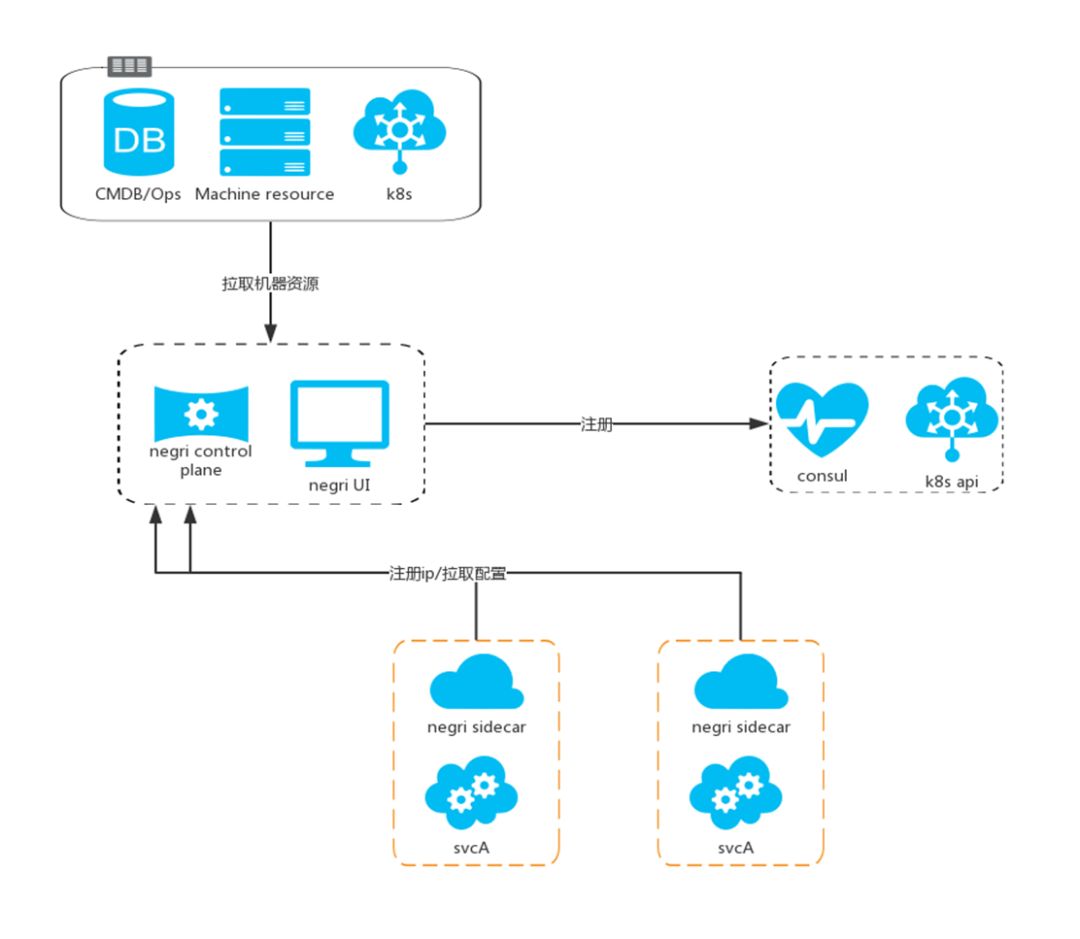 上图所示,这是 Negri 的整体框架图。Sidecar 被誉为构建下一代微服务的关键,对于构建高度高度可伸缩、有弹性、安全且可便于监控的微服务架构系统至关重要,因此 Negri 里对于如何部署配置 Sidecar 也十分的重视。