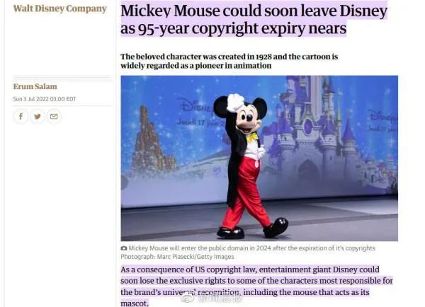 据英国《卫报》7月3日报道,随着“米老鼠”95年版权保护期的临近,迪士尼或将失去这个公司最具代表性的卡通形象的专有版权。