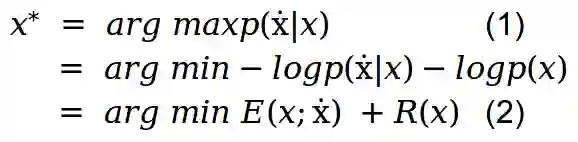 E(x;ẋ)是数据项,它是似然的负对数,R(x)是图像先前项,它是先验的负对数。