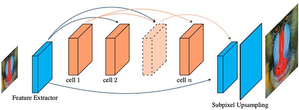 图 1:本研究采用的基础超分辨率神经架构(cell 间的箭头表示跳接)。