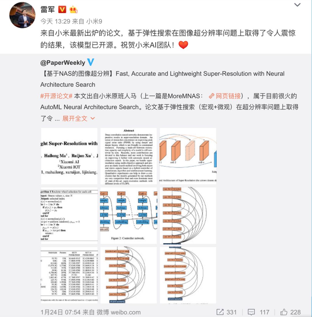 雷军表示:这是一篇小米最新出炉的论文,基于弹性搜索在图像超分辨率问题上取得了令人震惊的结果,该模型已开源。