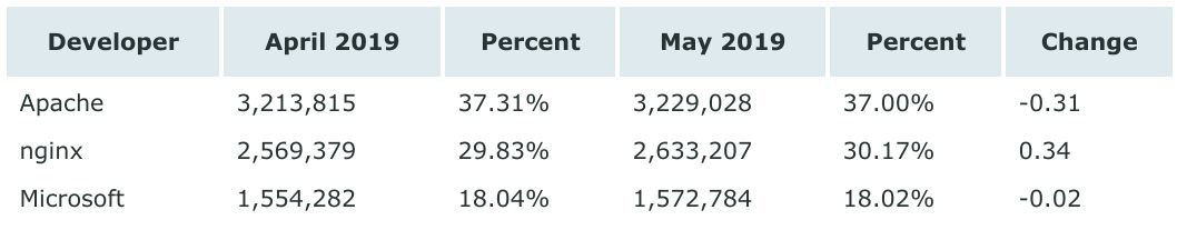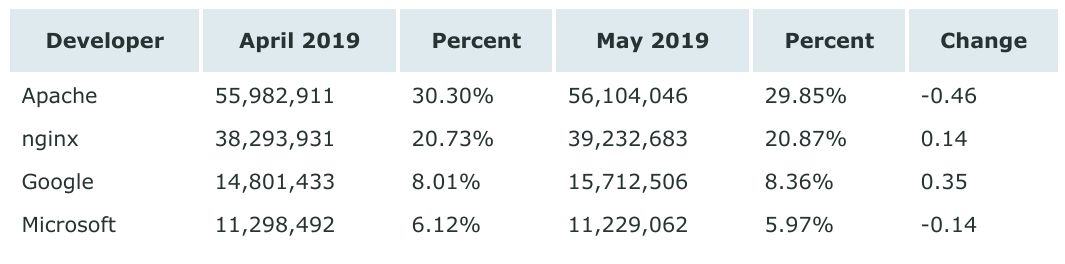 Netcraft 发布了 2019 年 5 月份全球 Web 服务器调查报告。Netcraft 公司官网每月公布的 Web Server Survey 是当今人们了解全球网站数量以及服务器市场分额情况的主要参考依据。