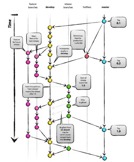 首先有一条master分支,这是发布稳定版,一般不会对 master 进行修改,当有新需求的时候,从 master 上分出一条 develop 分支,具体开发人员在从 develop 上分出自己具体 feature 分支,开发完毕后合并回 develop 分支,测试人员从 develop 分支分出 release 分支进行测试,没有问题了合并到 master 分支发布。如果线上有 bug 需要处理,则从 master 上分出 hotfix 分支,用来解决 bug。