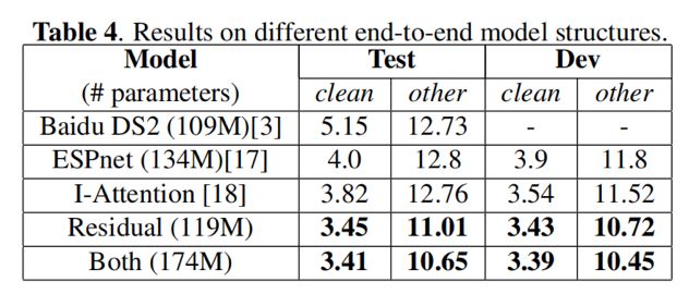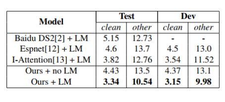 最后,作者使用基于 14600 本书的 Librispeech 公开语言模型扩充数据集训练了两层 LSTM 作为语言模型(LM),在语音识别数据集 Librispeech 上,取得了目前已公开的端到端语音识别网络中的最好效果。目前 Espnet 在 github 的模型,使用该扩充语言模型数据集训练的 LM 后在 test-clean 的表现为 WER=4.0%。相比之下,作者的方法效果提升 16.5%。