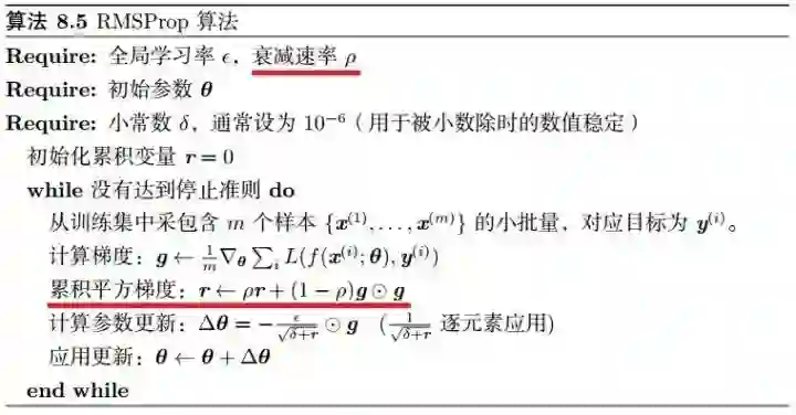 RMSProp 使用指数衰减平均(递归定义)以丢弃遥远的历史,使其能够在找到某个“凸”结构后快速收敛;此外,RMSProp 还加入了一个超参数 ρ 用于控制衰减速率。