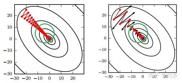 如果动量算法总是观测到梯度 g,那么它会在 −g 方向上不断加速,直到达到最终速度。